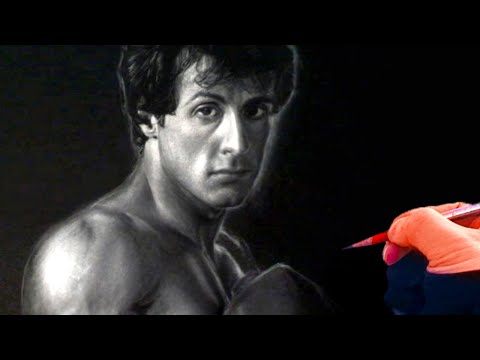 This drawing of Sylvester Stallone is done with mostly soft white charcoal pencil