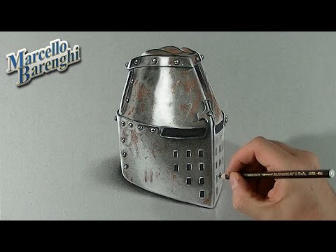 Drawing a realistic medieval helmet Final picture: http://www.marcellobarenghi.com/2013/04/drawing-medieval-helm.html Used tools: heavyweight gray paper, 9B, 7B and B pencils (Caran d'Ache grafwood), paper stomp, colored pencils (Caran d'Ache Supracolor Soft), fibre tip pens (Staedtler Noris Club 320 Double Ended Fibre Tip Pens), markers (Tria Letraset), white charcoal pencil (52 Carb-Othello 1400 Schwan), black and white acrylic (Decoart and Pebeo) Music by http://www.freestockmusic.com/2011/pop-production-music/free-pop-rock-stock-music-no-surrender/