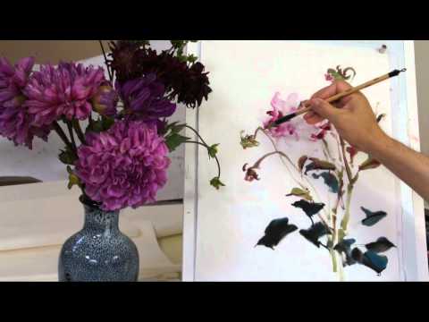 How to Paint Dahlia in Chinese Brush Painting with Sumi Ink and Watercolor on Cotton Xuan Rice Paper