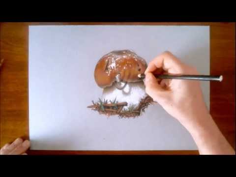 How to draw a Porcino mushroom (time lapse HD video) Final picture: http://www.marcellobarenghi.com/2013/03/porcino-mushroom-drawing.html Used tools: heavyweight gray paper, 9B and HB pencil; paper stomp, liquid watercolour ink (Ecoline); colored pencils (Caran d'Ache Supracolor Soft), markers (Tria Letraset), black and white acrylic and brush. Time taken: 1 hour 50 minutes Music by Dan O'Connor
