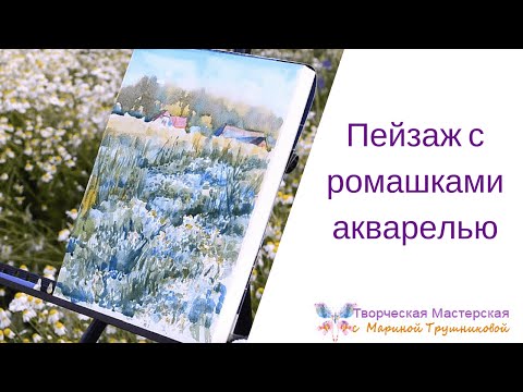 Пейзаж с ромашками акварелью